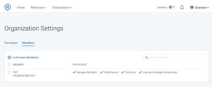 Here we can that we are the only member of our "Example" Organization, as well as view the level of access our account has. Because we have the privilege "Manage Members", we can click the Invite Team Member link at the top of the list and add more members.