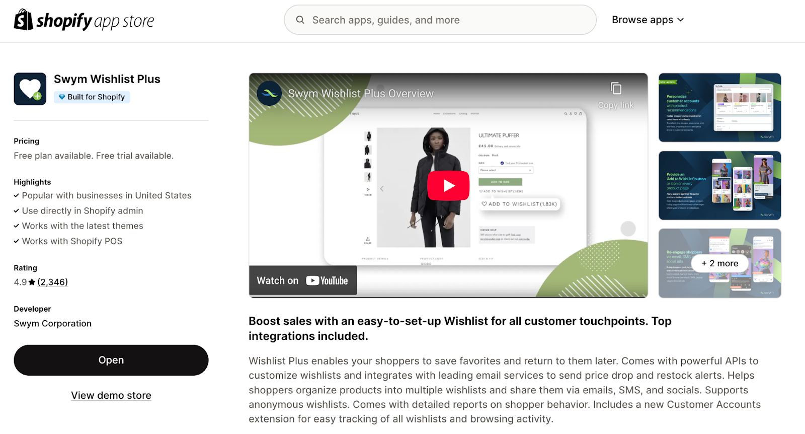 - Begin by installing the Wishlist Plus app from the Shopify App Store. You can either search for ‘Swym Wishlist Plus’ by Swym Corporation or click here for direct access.