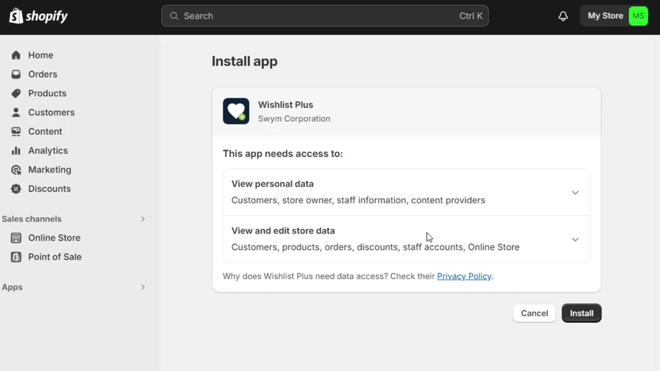 - You will be redirected to your Shopify Admin. Here, confirm the installation by clicking the “Install” button.